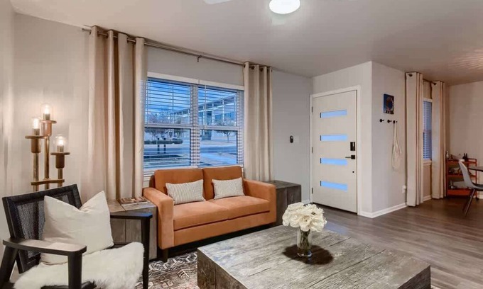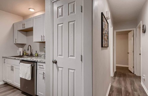 The living room and dining room are spacious. Smart TV w/Roku (Netflix, DirectTV Stream, etc...). The kitchen table is great for working, eating, or games. The kitchen is on the small side, but efficient and has everything you need for a full cooked meal. The full bathroom serves both bedrooms. The first bedroom has a queen bed, closet, and two end tables. The back bedroom connects to a back room that has it's own 1/2 bath, dedicated workspace with a desk, and full-size washer and dryer. You can access the private fenced patio from this room, or the enclosed sunroom down the hall.