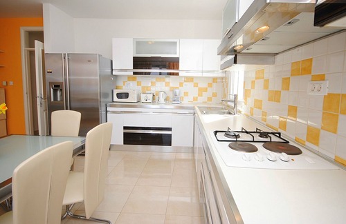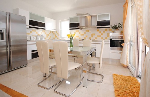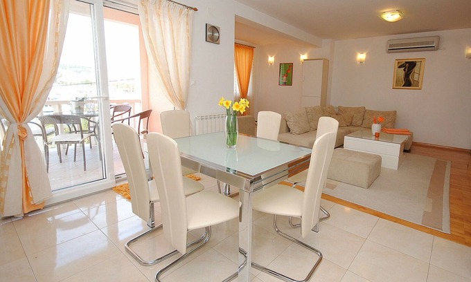 This new and modernly designed holiday apartment is located in Okrug Gornji on island Ciovo, 3 km from town Trogir. It is spacious - 120 meters square in size - all recently renovated throughout. It is situated just 10 meters from the sea and from the nearest pebble beach.