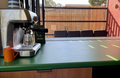 The Royale’s fully equipped (and very green) kitchen includes an induction cooktop, large fridge, espresso machine with Campos coffee, all-new appliances and vintage glassware. The open-plan design flows seamlessly into indoor and outdoor dining areas, creating the perfect setting for shared meals and relaxation.