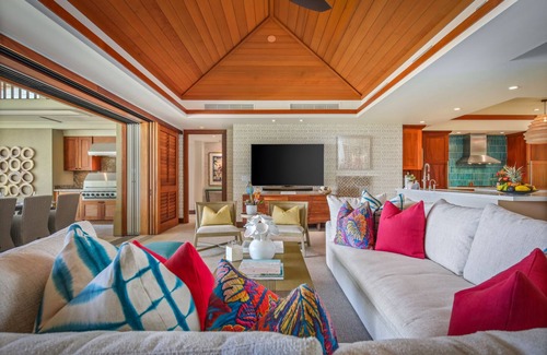 The award-winning Henderson Design Group has wholly redone this stunning 4 bedroom, 4.5 bath estate, and it is a feast for the senses. Located at the Hualalai Resort at Hualalai, the decor, furnishings, fixtures, and finishes are contemporary, opulent, and chic, evoking the island vibe with masterful skill. This home is outfitted with all the latest technology essentials, including lightning fast WiFi and a Sonos wireless home sound system. A dedicated media room, and workstations in the kitchen and primary bedroom ensure all your office and school requirements are easily accomplished. Individual climate control in each room and abundant ceiling fans ensure your absolute comfort day and night.