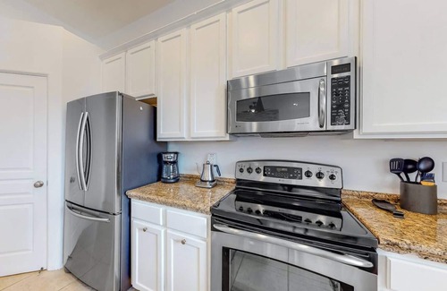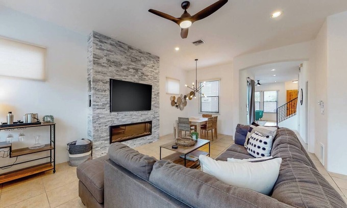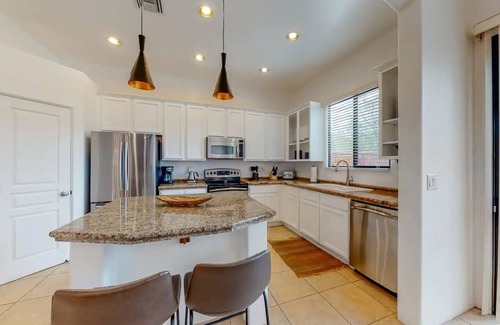 Enjoy the amazing desert sunrises and sunsets on the private front patio and back yard, and enjoy the amazing view as the stars come out each night unhindered by city noise. Onsite amenities include a shared community heated outdoor pool and spa. Inside, you’ll find an updated, relaxing space where modern meets chic. Highlights include a large, full kitchen, a dedicated office space for remote work, spacious rooms for gathering, and comfortable beds for restful sleep. After a full day out on the town or lounging by the pool, come home to relax in the central air-conditioning or get cozy in front of the electric fireplace and plan a family movie night. Casa Desert Rose is the perfect choice for your next home away from home in Tucson - all that’s left to do is book.