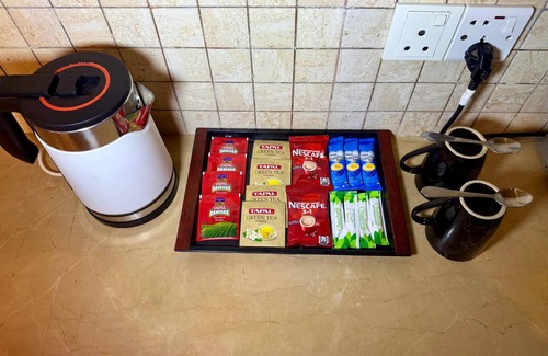 Welcome basket with snacks, chocolates, candies, water bottles, green tea, tea, milk powder & coffee