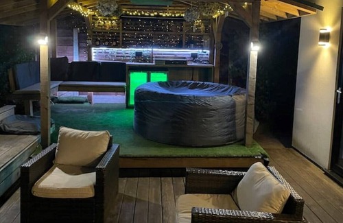 Downstairs has a state-of-the-art fitted kitchen with an open-plan living room and dining area. This space has been created for you to enjoy cooking and dining together in an open and sociable space. Outside has an enclosed lawned garden around the back with a patio area where you can enjoy the hot tub which features a hot plate and bar area.