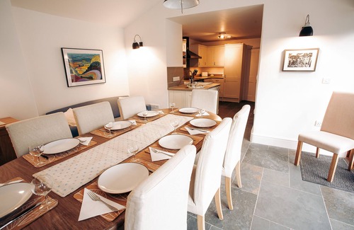 Kitchen/dining area which is open plan and well equipped with dishwasher, microwave, fridge/freezer, range cooker, washing machine, tumble dryer and table with chairs where guests can enjoy supper whilst looking over the garden. Bi-folding doors let the outside flood in and provide access onto the terrace which is ideal for alfresco dining during the warmer months.