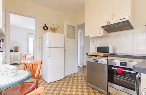 Detached single-story house with several steps at the entrance. Kitchen (induction hob, oven, refrigerator with freezer, dishwasher, microwave, espresso machine). Living room with lounge area (TV, DVD, stereo, books). Balcony terrace with sea view. Shower room. Separate toilet. Bedroom 1 (2 beds 90X190). Bedroom 2 (1 bed 140X190). Baby equipment on request. Electric heating included. All charges included. Sheets for hire. Towels and household linen not provided. Cleaning service at an additional cost. Private enclosed garden. Garden furniture. Deckchairs. Barbecue. In the basement, large storeroom with washing machine, gas stove and separate toilet. Parking. In the basement, a small studio with a double bed can be used as an extra bed. Just outside Granville, the small seaside resort of St Pair-sur-Mer and its beautiful villas offer an ideal setting for family vacations by the sea. Jean-Yves, the owner, renovated this lovely house with a basement, taking care not to spoil its 1960s feel. You'll enjoy the parquet floors and cement tiles, as well as the beautiful custom-made kitchen cabinets! From this peaceful neighborhood, you can walk to the beach below. In summer, the basement makes it easy to return from the beach and spend time in the garden.