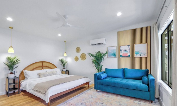 As you step into this elegant suite, you’ll be captivated by its boho glam decor and designer touches. The open-concept layout is both stylish and inviting, with a plush king-sized bed as the centerpiece, dressed in premium linens for a restful night’s sleep. The adjacent seating area features a sumptuous sofa that effortlessly converts into a queen-sized bed, providing comfortable accommodations for additional guests. A wall-mounted streaming TV invites you to kick back and enjoy your favorite shows, while the mini fridge and Keurig coffee bar offer added convenience for morning brews or late-night snacks.