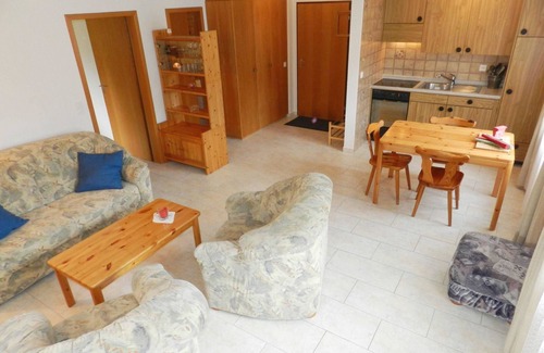 Living / dining room with dining table, sofa which converts into a conventional bed (140x190cm, for max. 1 adult or 2 children), 2 armchairs, TV (Swisscom) and open-plan kitchen (equipped among other things with oven, refrigerator with freezing compartment, coffee machine with capsules (Dolce Gusto), toaster, electric kettle as well as a raclette- and fondue set). 1 bedroom with 2 pushed toghether single beds (2x90x200cm). 1 bathroom with bathtub and toilet. WiFi.
