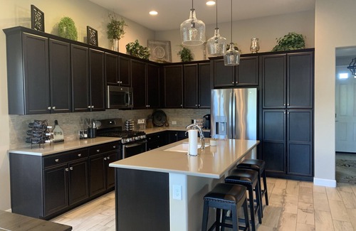 This is a newer private 1900 sq ft home with beautiful entry seating area, opulent master bedroom with 75-in TV and walk-in closet, separate guest ensuite, office/den with sofa bed, powder bathroom, large open great room/kitchen/dining area with 86-inch TV, backyard meant for entertaining with multiple conversations areas, out-door dining space, and built-in BBQ island. Home has a 3-car garage with golf cart included at no extra cost during your stay. Fully furnished home with well-equipped gourmet kitchen.