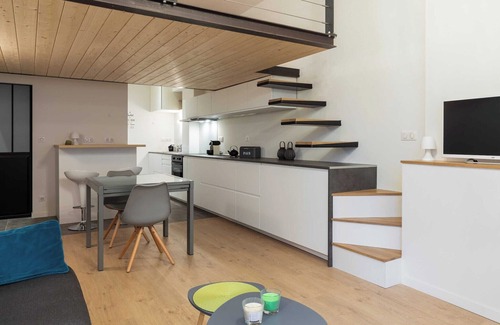 Apartment with lots of character, completely renovated and decorated by a prestigious architect. null This fully renovated and equipped apartment can accommodate up to 4 people (a mezzanine bedroom with a double bed and a living room with a very comfortable double sofa bed with a real mattress). You will have exclusive use of the apartment and be free to use all the facilities. Bed linen and towels are provided. Unlimited internet, TV, equipped kitchen, coffee machine, washing machine.