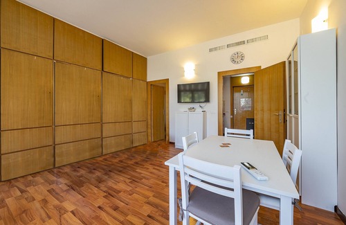 In a unique location near the lake and surrounded by a beautiful green park, this completely renovated studio flat is located on the second floor of a former hotel complex with a view of the lake from the balcony and two entrances to the large panoramic swimming pool in the communal green park.