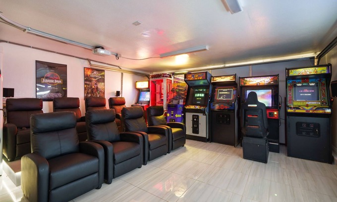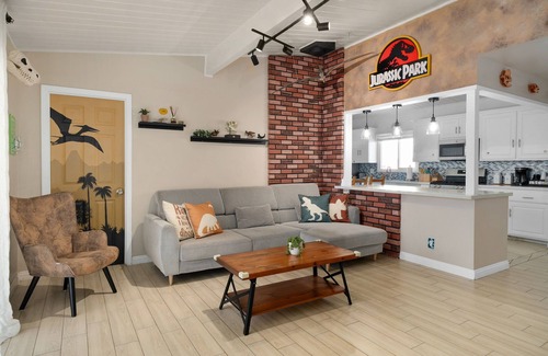 Experience the world of Jurassic Park by staying in this one-of-a-kind 5BR 2.5Bath home just an 8 min drive from Disneyland. Marvel at the life-size dinosaurs wandering around the playground and mini-golf course, or play for hours in the arcade.