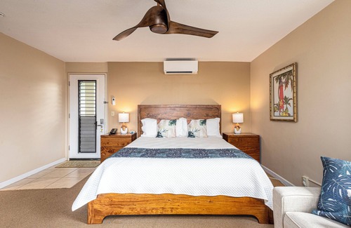 Lovely and romantic, this popular honeymoon destination condo overlooks Bali Hai and Hanalei Bay. The room boasts a comfortable, king size bed with designer bedding, large remodeled bathroom, a small sofa sleeper, and large slate covered private lanai for sunset viewing.
