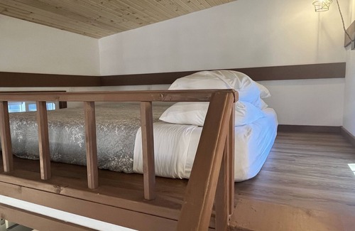 -Sleeps 4 comfortably: queen loft bed, pull-out couch, plus child-friendly bean bag bed