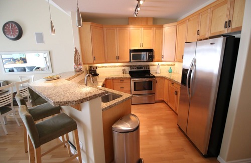 This suite is equipped with TV’s in the living room and both bedrooms with cable service and high speed Wi-Fi (internet). This fully equipped suite comes with kitchen dining for 4 including a blender, toaster, coffee maker, bath towels, bed linens, an in-suite washer/dryer with laundry detergent and a gas BBQ on the deck. Within the secured, undercover building parkade you will find a reserved SINGLE car space.