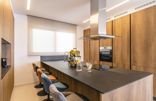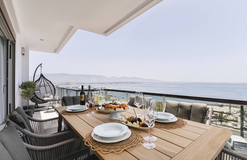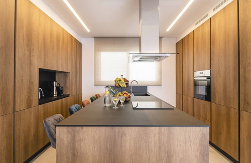 Three double bedrooms with sea views and king size beds with premium linen await to inspire you. One of the bedrooms feature an en-suite bathroom with walk in shower for ultimate comfort. Another bedroom feature also an en-suite walk in closet. The third bedroom features also a king size bed with balcony and sea views. A shared master bathroom with bathtub and hydromassage features awaits you for endless wellness time. All bedrooms are effortlessly and elegantly furnished promising a blissful night's sleep after the day's busy adventures.