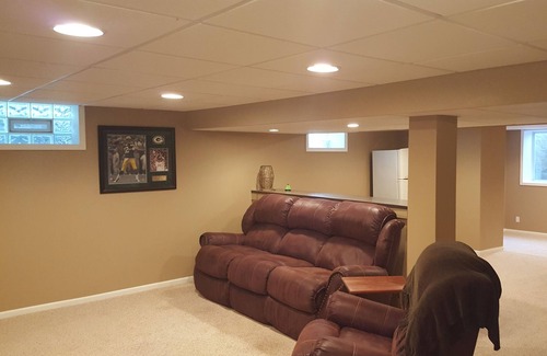 Comfy and cozy large house with 2.5 car garage. Open floor plan with master suite (king bed) on first floor, and two bedrooms (queen beds) upstairs with full bathroom. Huge finished basement with 75in TV and infrared sauna. Large backyard with shaded deck/patio. Lounge on the pool deck, or cool off in the 27ft pool. Then enjoy the evening with a fire in the fire pit.
