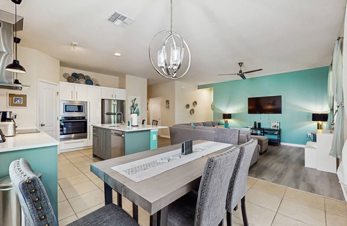 Located within an exclusive gated community, this lake view home is the perfect choice for families with children looking for a peaceful getaway! Enjoy the luxury of having your own private, screened-in patio with a comfortable lounge area and entertaining games, including corn-hole and a small, coastal-themed Tic Tac Toe. Inside this family-friendly retreat, you will come across a delightful open floor plan with new hard-surface flooring, seamlessly combining the living area, dining area, and the kitchen. Cozy up on the comfortable sectional and watch a favorite show or movie on the flatscreen TV with cable, or pull out any of the board games available for a fun evening challenging each other to a friendly game. Then, when mealtime comes around, the chef of the group will surprise everyone with a delicious full-course meal prepared in the fully appointed kitchen. Equipped with all stainless steel appliances, a Keurig coffee maker, and a convenient island with seating for two, this kitchen is perfect for both cooking and entertaining. The adjoining dining table has enough space for up to six people comfortably.
