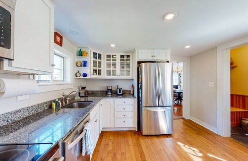Curl up by the warmth of the classic gas stove while reading a favorite book or planning your next adventures. When mealtime comes, surprise your guests with delicious homemade meals prepared in the well-appointed kitchen, with stainless steel appliances and granite countertops. You can step it up a notch and take advantage of the Weber gas grill for some summertime cookouts. There is a deck off the dining room, which allows you to admire the gorgeous views of the fenced yard and garden. Additional perks include an on-site washer/dryer, board games, and a firepit.