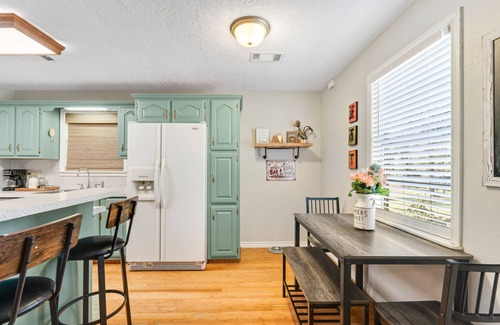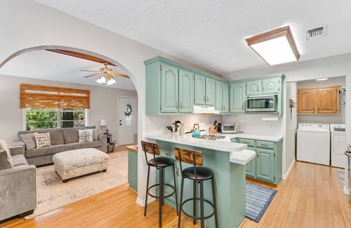 This charming home welcomes you with an inviting living room with comfortable sofas and a smart TV with streaming services to keep you all entertained. DVD and Blu-ray players with movies are available as well. Show off your cooking skills in the well-appointed kitchen, complete with all the major appliances needed that will make cooking a breeze. Attached to the kitchen is a laundry area with a washer/dryer for your laundry needs. When it comes to outdoor entertainment, the home enjoys a covered front porch with seating and a firepit surrounded by inviting chairs. Additional perks include a mini-fridge in the living room and board games.