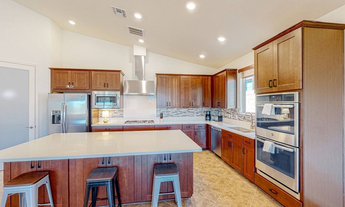 Walking inside, the home's central air-conditioning will instantly greet you. Brightly lit and well-decorated, the spacious living room features soft seating and a large TV. The full kitchen is sure to have the adoration of the chef of your family with its suite of stainless steel appliances, double ovens, gleaming countertops, and sprawling center island. Dining will come easy at the sizable formal dining table, or alfresco on the patio.