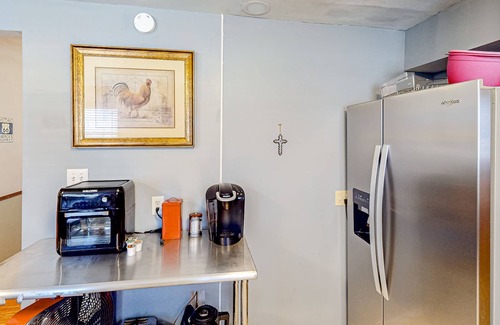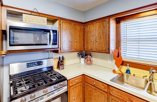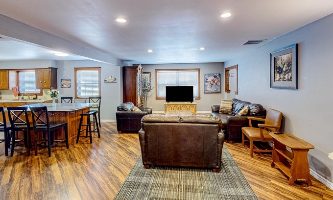 Multiple indoor living spaces provide plenty of flexibility for family gatherings or breakout group entertainment. The main living area is ready to welcome casual downtime and movie nights, while two bonus rooms offer features like a mini fridge, microwave, and a collection of board games for happy hour fun. You'll be able to plan home-cooked meals with ease in the stainless steel full kitchen. Additional home essentials include central air-conditioning, lightning-fast fiber internet, and a private washer/dryer.