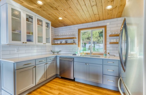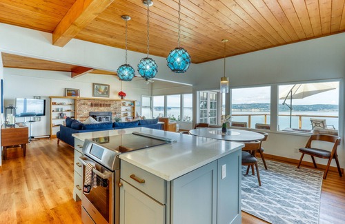 Admire spectacular views of Mt. Baker, Whidbey Island, and incredible sunsets over Puget Sound at this newly-remodeled home on the shores of Camano Island. Spend your days observing bald eagles and herons in flight over Skagit Bay, and throw a log on the woodstove when it's time to watch a favorite movie or show on the TV in the living area. In warm weather, you can relax on the expansive deck, stretch your legs in the enclosed yard, and roast marshmallows over the outdoor firepit as you take in the stunning water views.