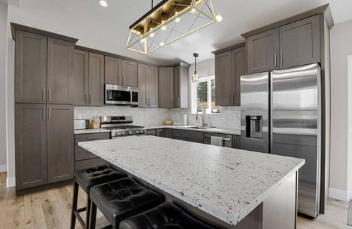 You and your guests will feel right at home when you stay at this spacious newly built home. Adventure is at your doorstep. This thoughtfully designed retreat is located near many attractions including hiking trails and world class fishing. The large kitchen features all new stainless steel appliances, gas cooking stove, and beautiful stone countertops. This open floorplan allows the cook of the family to be apart of the action. The kitchen island seats 3 while the large dining table hosts 6 additional seats for family dining.
