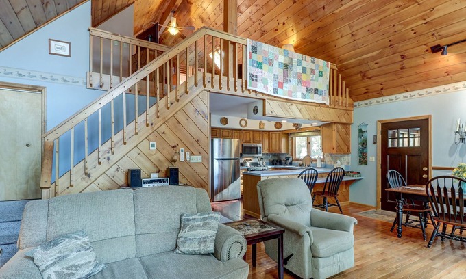 This extremely popular lakefront chalet offers a spacious great room, lake rights on the eastern shore of Loon Lake, and a dog-friendly attitude so the whole crew can come along. You'll have a breakfast bar, two sets of sliding patio doors that lead to the front deck, and a screened-in porch just off the dining area for extra room for board game nights if you've brought some along. Three separate levels provide privacy and peaceful retreat areas, and the upper level has an additional living room. You'll have air conditioning throughout, as well. The shared sandy beach at the Association area is a two-minute walk down a quiet back dirt road so that you can be relaxing on the beach in no time at all. Relax and enjoy this exceptional vacation home.