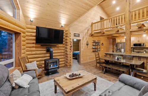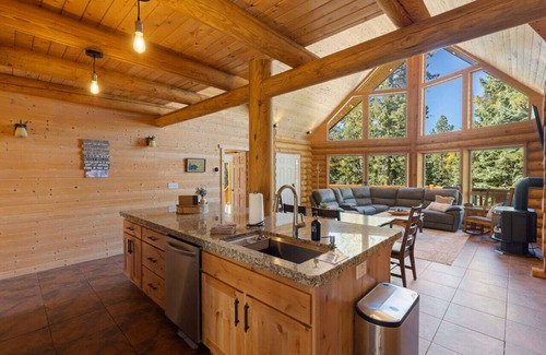 On the main level, you will find two luxurious master suites, each furnished with king-sized beds for your comfort. The beautifully appointed living room offers panoramic views of the enchanting pine tree landscape that surrounds the cabin. Our fully equipped kitchen has everything you need to prepare your favorite homemade meals. Unwind in the living room next to the cozy fireplace on the plush recliner couch while taking in the picturesque scenery or watching your favorite movie.