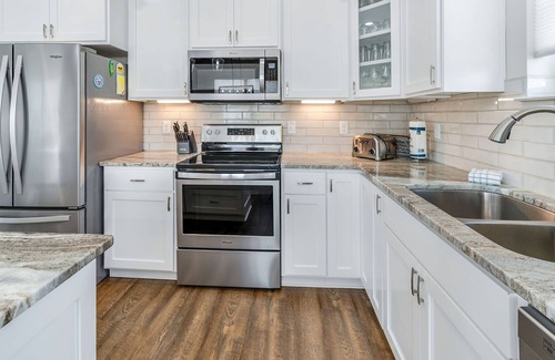 The interior is light and inviting with minimalism in mind. An open floor plan and natural light connects the living room, dining area, and kitchen together. The kitchen is fully stocked with dishes, utensils, and a starter supply of amenities. Kitchen inventory is plentiful, including a propane grill, allowing for the most experienced chefs to cook-in. The living room provides large deep seated sofas with a designated work space for those that must combine work with their play.
