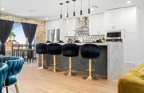 This stunning 5-bedroom, 2-bathroom home showcases an open floor plan and designer-inspired decor, creating a playful, yet chic atmosphere for entertaining and gathering.