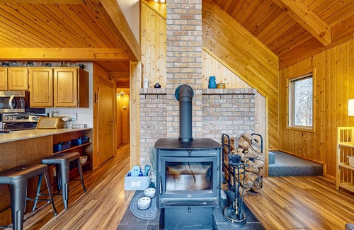 The main living area sits beneath vaulted ceilings, with large picture windows bringing the outdoors in. It's a wonderful space to cook in the well-equipped kitchen, dine with your loved ones, and play board games and watch movies by the woodstove. The cabin is also particularly well-suited to families, offering a bunk room full of children's books, a loft play area (which also has a desk if you'd rather make it a workspace), and a washer/dryer. The primary bedroom upstairs includes a TV of its own as well.