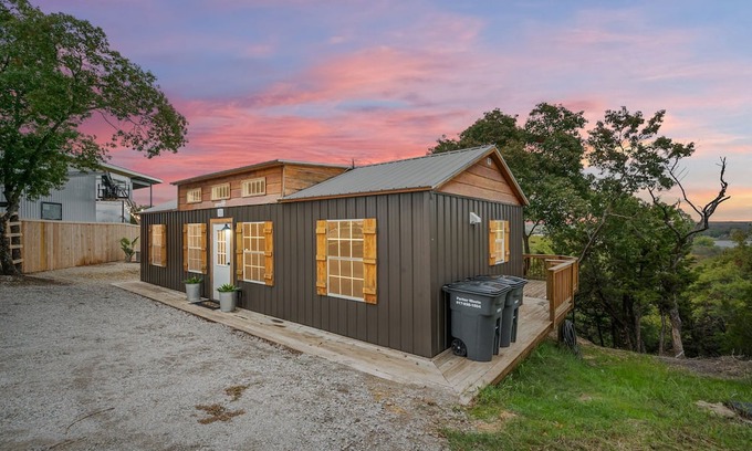 Welcome to our unique container home nestled in a serene setting, offering breathtaking views of Lake Weatherford. Perfectly positioned to provide a tranquil escape, this one-of-a-kind accommodation is designed to immerse you in the beauty of nature while enjoying the comforts of modern living. The open-plan layout seamlessly combines cozy living areas, a fully equipped kitchen, and a dining space, all adorned with large windows that frame stunning views of the waters below.