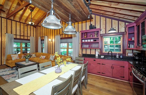 Step into the inviting main level, where the soaring ceilings, a plush sectional sofa, and a large flat-screen Smart TV create a welcoming atmosphere. The open-concept great room is designed to make you feel right at home during your vacation, offering the perfect space to relax and spend time with loved ones. The well-equipped kitchen is a chef's delight, featuring modern appliances, ample counter space, and everything you need to whip up delicious meals with ease.