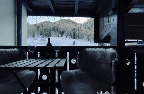 - Balcony with a table and two chairs, offering a relaxing forest and mountain view.