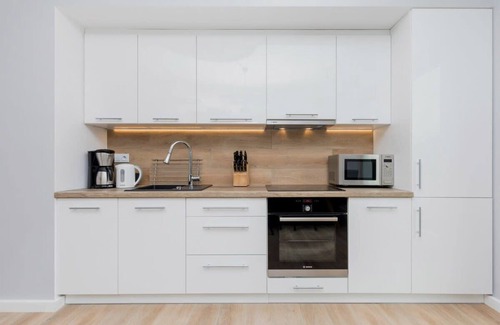 The interior of the apartment includes a spacious living room with a modern kitchenette, which is perfect for cooking together and spending time with your loved ones. Guests also have access to 2 cosy bedrooms and 2 stylish bathrooms with showers, ensuring convenience and comfort for everyone staying there. The kitchenette is equipped with a full range of appliances, allowing you to prepare both a quick breakfast and a wholesome, home-cooked dinner.