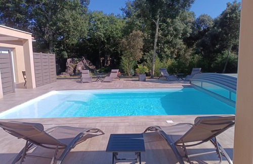 The 4x8 swimming pool with underwater alarm is shared with an adjoining furnished apartment for 2 people. Plancha for outdoor dining, washing machine, ironing board and iron, mini-oven are available.