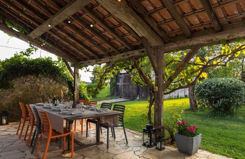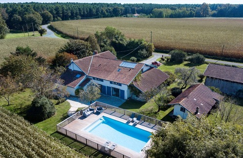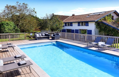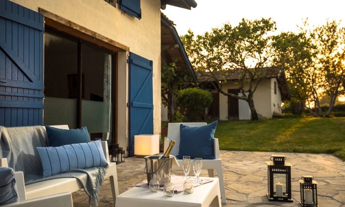Domaine d’Orx is a charming farmhouse-style cottage in the peaceful countryside near Hossegor's beaches. With vine-draped terraces, exposed beams, and blue shutters, it offers classic French style with modern comfort, accommodating up to ten guests. Each room has a private bath or shower, making it perfect for two families or several couples. Amenities include a fenced, heated pool, table tennis, a home cinema, and spacious gardens. The owners live nearby and offer optional services like catering and babysitting, with chef Vincent’s meals highly recommended for a special dining experience during your stay.