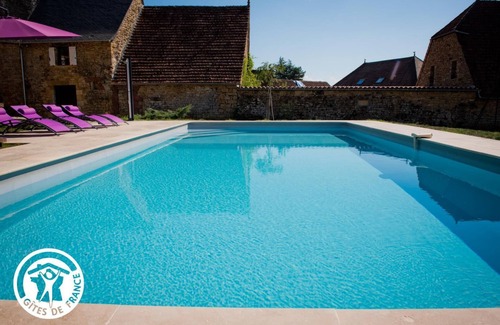 Possibility to rent the cottage for 4 people with adapted rates, part of the house will be closed if you rent the accommodation for 4 people. the soul of the place: an old walnut oil mill dating from the 16th century and renovated with respect for the built heritage and with the use of noble materials. This character cottage offers pleasant, comfortable and spacious living spaces, combining tradition and modernity, as well as great amenities with its private swimming pool, its pétanque court, all in a preserved environment... Located in a quiet hamlet, you will be able to take advantage of the calm of the place and totally enclosed with its surrounding wall on the courtyard side and criss-cross the various tourist sites of the Dordogne valley. Gîte of 250m² with on the ground floor an independent kitchen and a dining room with laundry access. Access by five steps to the open room in the living room, then to the right to the bedrooms Rose (1 double bed 160) and Green myth (1 double bed 160), with a bathroom (thermostatic shower), separate toilet . From the living room, access by three rising steps to the Taupe bedrooms (2 single 90 cm beds) and Yellow bedrooms (1 double 160 cm bed), with a second bathroom (thermostatic shower), separate WC and relaxation area on the ground floor. swimming pool. Electric heating and internet/wifi. Clothes dryer. Land of 1500m², courtyard of 200m² and garage of 30m². Swing, petanque court, private swimming pool with alarm (5x10m, 1 to 140m deep), table tennis, garden furniture and plancha.