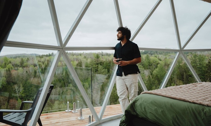 Escape to a luxurious dome in Saint-Côme, Lanaudière. This intimate sanctuary offers breathtaking valley views, a king-size bed, private bathroom, fully equipped kitchen, and a cozy lounge with a wood stove. Outside, enjoy a large terrace with a private wood-heated spa, dining area, barbecue, outdoor shower (closed during winter), and campfire area. Designed for your well-being, it’s the perfect getaway. Book now for an unforgettable experience!