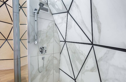 The Twin Dome is made up of two wooden domes which are connected by a sliding door. The interior has a voluminous and comfortable layout that divides the salon into two areas. The bedroom and full bathroom are in one dome, and the kitchen, living room, and half bathroom are in the other.