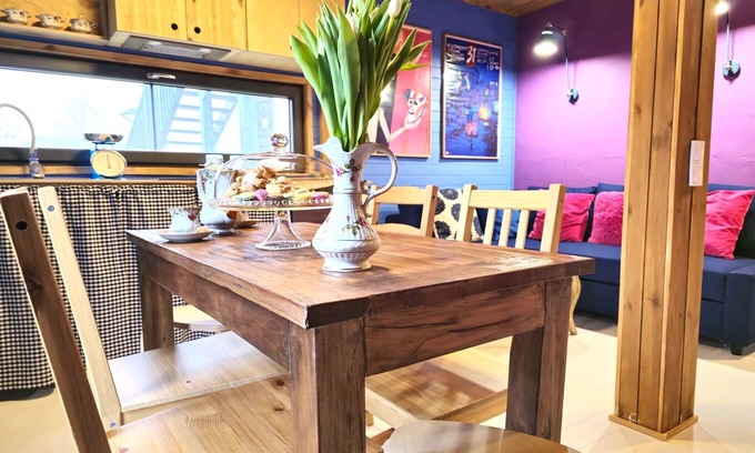 Wnętrze domku otula ciepłymi barwami i naturalnym klimatem. Przeważają tu ręcznie wykonane drewniane elementy, tworząc atmosferę harmonii i relaksu.