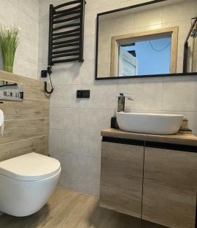 15 miles from Zamość Synagogue in Zwierzyniec, Domek na Roztoczu Obrocz 73C z SAUNĄ provides accommodations with access to a sauna. This property offers access to a terrace, darts, free private parking, and free Wifi. The property features barbecue facilities and outdoor furniture. The air-conditioned vacation home consists of 2 bedrooms, a living room, a fully equipped kitchenette with a dishwasher and a coffee machine, and 2 bathrooms with a shower and a hair dryer. Towels and bed linen are provided in the vacation home. There's also a seating area and a fireplace. Guests at the vacation home can enjoy cycling nearby, or make the most of the garden. Zamość Town Hall is 15 miles from Domek na Roztoczu Obrocz 73C z SAUNĄ, while Zamość Cathedral is 15 miles away. Lublin Airport is 63 miles from the property.