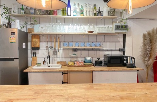 - ห้องครัวขนาดเล็ก ที่มีเครื่องใช้ไฟฟ้าพร้อมให้บริการ เช่น ไมโครเวฟ กาต้มน้ำ เตาเซรามิกไฟฟ้า พร้อมอุปกรณ์สำหรับถ้วยชาม .