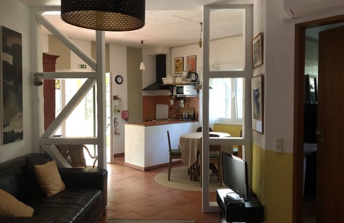 This small apartment, the ground floor of a charming villa in Galamares, communicates directly to the garden and includes a large living room with a 4-person dining area and a kitchenette, two comfortable and furnished bedrooms, a double bedroom and a another with two beds and a spacious bathroom.