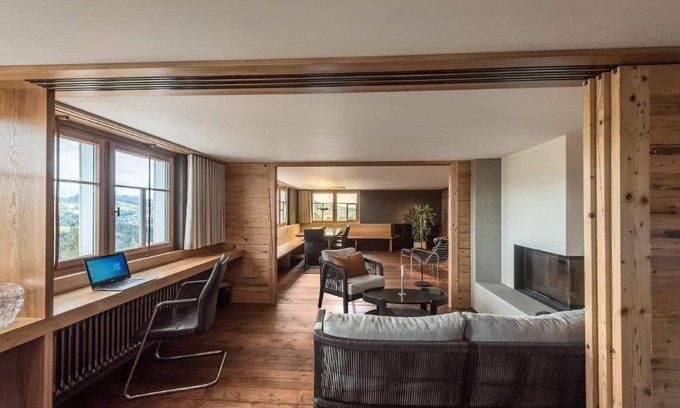 Spending the night here, with a unique view over the Appenzellerland as far as the Säntis, is an experience in all seasons.in the stylishly renovated, listed house on the historic village square of Rehetobel, old building fabric is combined with modernity.the five-storey, stately house has served several purposes in its 230 years. Where there is now a pretty "Beizli", the "Gasthaus Dorf5", with a wonderful garden inviting you to linger, there used to be the Rehetobel post office.the upper floors, which served as a telegraph office and business premises, now house three flats with a high standard of finish.the spacious, light-flooded flat offers a 180 degree view, a beautiful balcony and spacious living rooms with a fireplace. Sliding doors allow the rooms to be converted according to requirements, while the natural building fabric with lots of wood and the generous furnishings are of a high technical and aesthetic standard. The central location in the Appenzeller Vorderland is ideal for exploring the Alpstein region, the nearby Lake Constance region and the extremely attractive city of St.Gallen.The flat on the second floor offers plenty of space for two to four people and you will find many cosy places to linger. Cooking in the modern kitchen is a pleasure - or would you prefer to be spoilt in the "Beizli" downstairs? for more than four people we recommend the "Alpsteinpanorama" flat in the same building.
