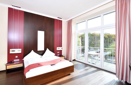 The hotel room has a balcony with a seating area where you can enjoy the beautiful view. You look out over the natural surroundings and partly over the beautiful Rursee.