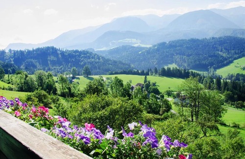 Quietly situated holiday farm with stunning panoramic views, sauna, granary with open fireplace, sun terrace with barbecue, sunbathing lawn, play area, petting animals, tobogganing by torchlight with tractor taxi, torchlight walks, farm's own products and children's juice bar.