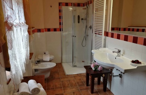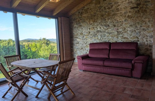 Double room with shower/WC and panoramic veranda (47 m²). Ideal for two people with up to 2 children. The room is comfortably furnished in a rural Tuscan style. The veranda with kitchenette provides additional privacy to your stay.