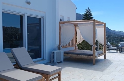 Tholos luxury villas comprise of 2 modern spacious, fully air-conditioned villas with a private pool,swim trainer, hot tub and BBQ.Resting on the exclusive east coast of Crete,the villas overlook the sea to the east and the beautiful mountain area to the north. As a family we had been looking to build in Crete for some time and fell instantly in love with the view,beautiful sunsets,absolute privacy and tranquility of the location. The villas were built 3 years ago to let out to guests but also very much as a holiday home for us all to enjoy.We grandparents share the smaller 2 bedroom villa,whilst our children and grandchildren use the larger 2 bedroom villa immediately above.The benefit of having 2 villas will allow you to spend time with friends or family but also have your own personal space.In winter months you can book just one villa knowing the other villa will remain empty for your stay.Welcome pack,TV,toys,games,books & pool toys incl. Midwk clean & cooked meals available